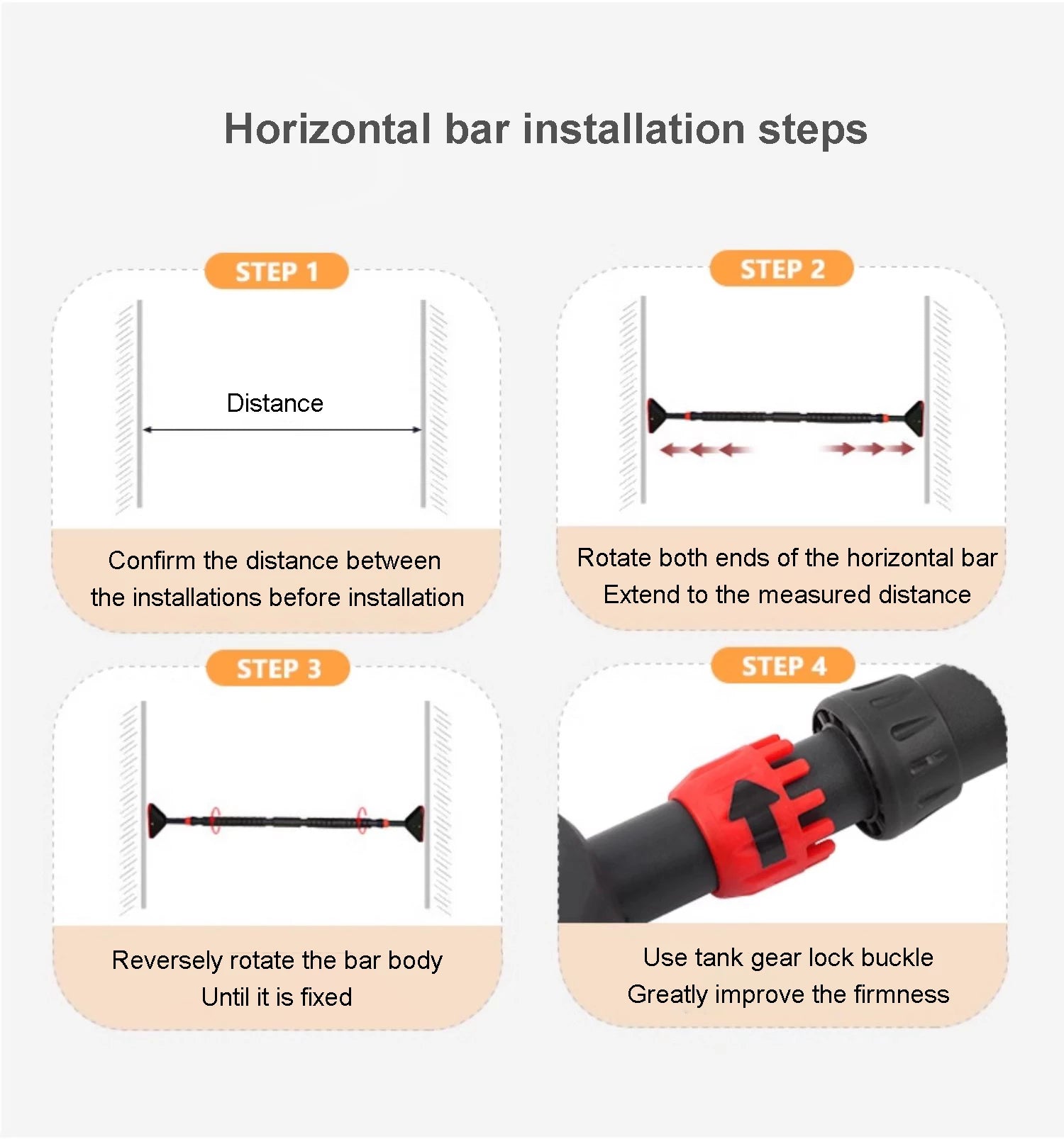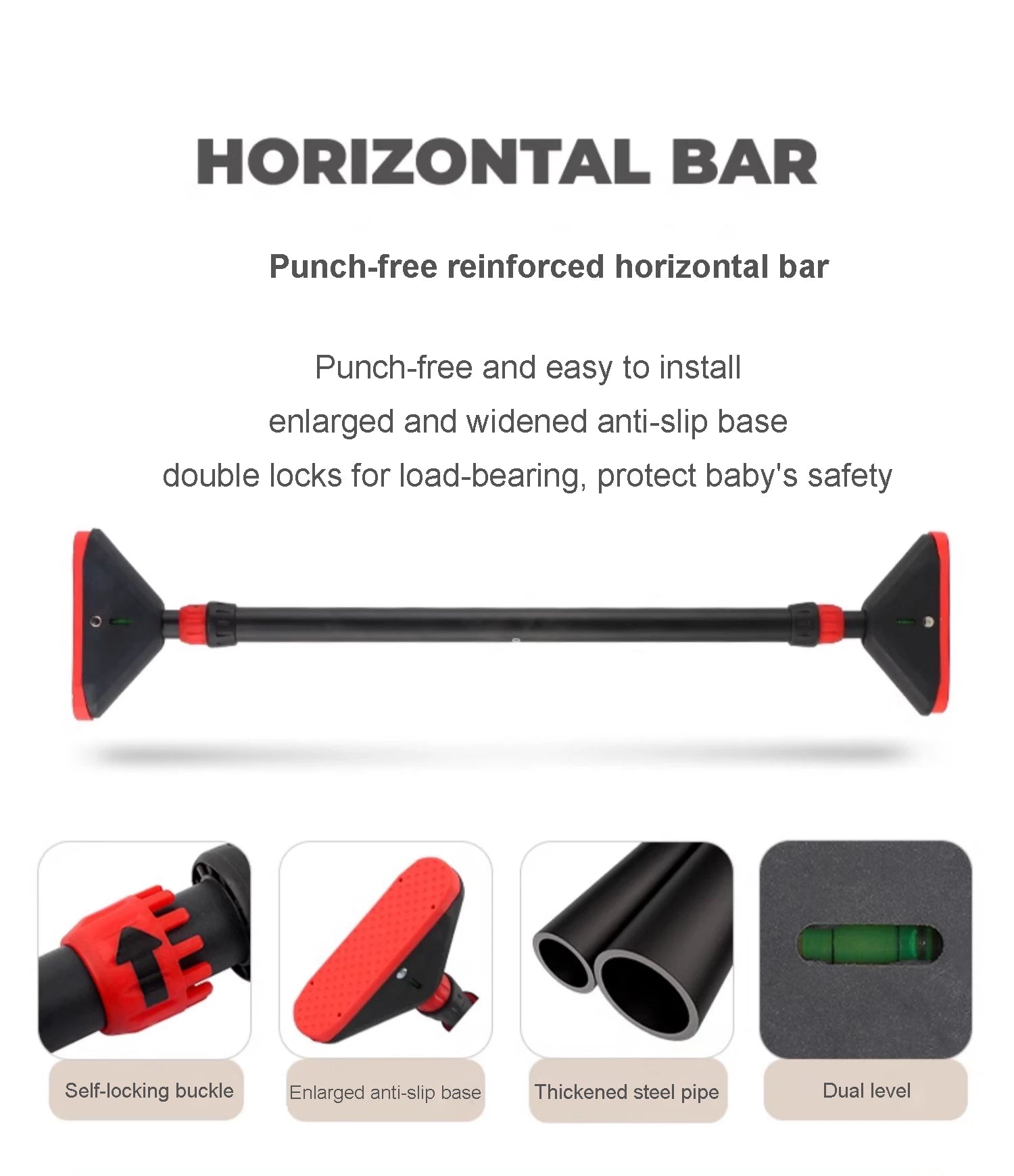 - Punch-free reinforced horizontal bar: Equipped with a punch-free horizontal bar, the double lock can fix the position of the horizontal bar and has a strong load-bearing capacity. The swing can also be used outdoors. The horizontal bar is made of PVC/EVA material and is very strong.