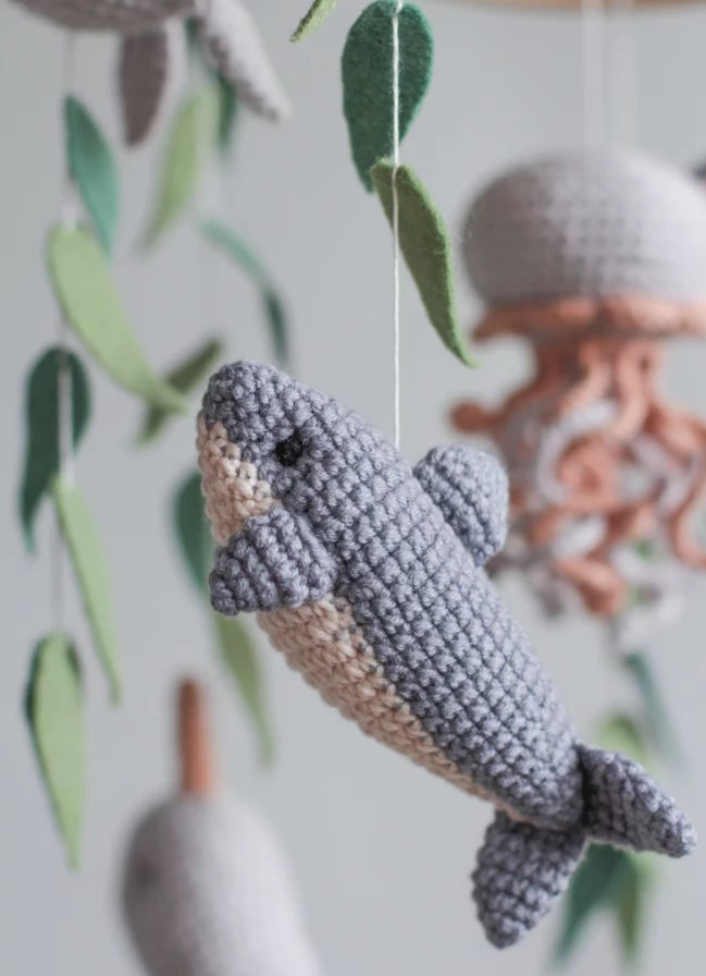 Ocean baby mobile with Narwhal, Jellyfish, Turtle, Stingray fish, Shark, Starfish and Puffer fish is perfect for a nursery in ocean style. Your baby will love it!